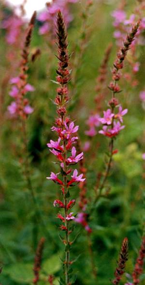 | Lythrum salicaria L. der Blutweiderich. Oft zu finden auf der nördlichen Hemisphäre (außer N-Amerika) vor allen an feuchten bis nassen Stellen. Dort wird er bis zu 2m groß und häufig bestandsbildend. Bevorzugt werden feuchte Böden, z.B. in Gräben. |